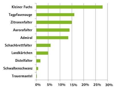 Von den mehr als 21.000 beobachteten Schmetterlingen war 2012 eindeutig der Kleine Fuchs am häufigsten vertreten (28 Prozent). Den zweiten Platz teilen sich Tagpfauenauge, Admiral, Aurora- und Zitronenfalter mit je etwa 15 Prozent. Trauermantel und der Schwalbenschwanz bilden wie in den Vorjahren das Schlusslicht, mit je weniger als einem Prozent Anteil. Etwas besser sah es 2012 für Landkärtchen und Schachbrettfalter aus (fünf bzw. sechs Prozent).