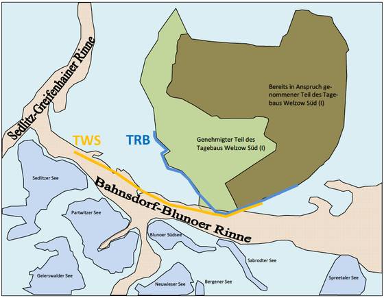 Rinnensystem und Dichtwandvarianten (TWS=Variante Vattenfall, TRB=Variante BUND)
